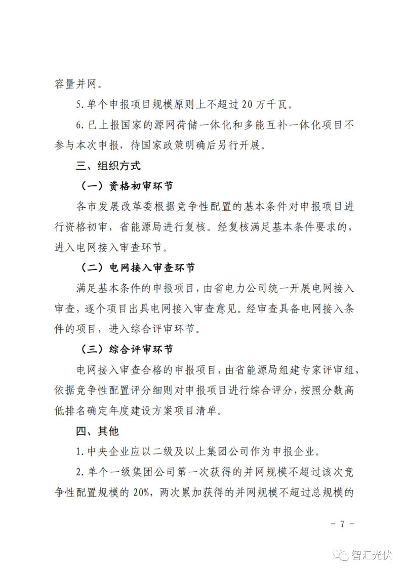 4)光伏項(xiàng)目:單個(gè)申報(bào)項(xiàng)目規(guī)模原則上不超過 20 萬千瓦。單個(gè)一級集團(tuán)公司第一次獲得的并網(wǎng)規(guī)模不超過該次競爭性配置規(guī)模的 20%,兩次累加獲得的并網(wǎng)規(guī)模不超過總規(guī)模的20%。