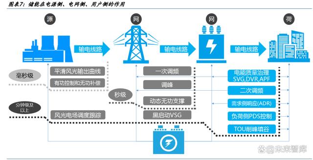 電源側:1)平滑、調(diào)峰作用:由于光伏、風電、水電的隨機性、波動性特征, 電源側需要儲能以實現(xiàn)電力從秒級到季度的供需平衡;2)黑啟動:借助儲能電 量帶動無自啟動能力發(fā)電機組。