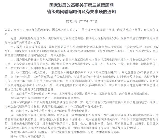 5月15日,國家發(fā)改委官網(wǎng)發(fā)布《關(guān)于第三監(jiān)管周期省級電網(wǎng)輸配電價及有關(guān)事項的通知》(發(fā)改價格〔2023〕526號)、《關(guān)于第三監(jiān)管周期區(qū)域電網(wǎng)輸電價格及有關(guān)事項的通知》(發(fā)改價格〔2023〕532號)關(guān)于輸配電價的重要文件。本次文件在2015年電力市場化改革后可以視為里程碑式的文件。