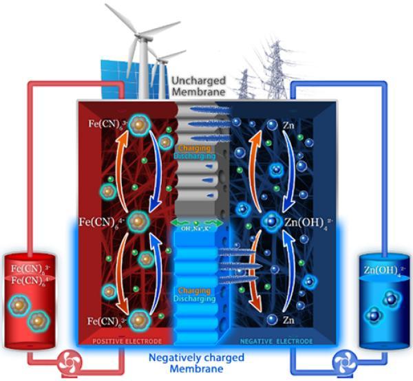 鋅鐵液流電池選用礦藏儲量豐富且價格穩(wěn)定的鋅、鐵元素組成配對,依靠鋅酸鹽離子和鐵離子之間的電化學(xué)反應(yīng)來實現(xiàn)電能的儲存和釋放,采用堿性電解液,擁有零爆炸零燃燒的特性,電池放電次數(shù)超過20000次,使用壽命超過20年,在額定功率輸出下,放電時長超過8小時。