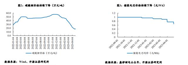 碳酸鋰降價大背景下,儲能電站經(jīng)濟(jì)性改善有望推動電站裝機持續(xù)放量。受電動汽車需求萎縮影響,碳酸鋰價格由2022年末 高點的57萬元/噸持續(xù)下跌,到2023年4月碳酸鋰價格最低已跌至17.65萬元/噸,相比最高點價格下滑68.9%。碳酸鋰價格下同 樣帶動儲能電芯售價持續(xù)下降。截至2023年4月28日,儲能電芯均價已跌至0.66元/Wh,相比此前的價格高點已經(jīng)降低了33.7%。 儲能電芯作為鋰電儲能系統(tǒng)當(dāng)中的主要零部件成分,其價格走低有望進(jìn)一步降低鋰電儲能系統(tǒng)成本提升儲能電站運營的經(jīng)濟(jì) 性,刺激終端業(yè)主的裝機需求。成本下行大背景下,全球儲能裝機有望持續(xù)走高。