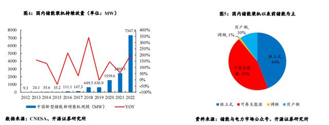 國內(nèi)儲能裝機有望持續(xù)增長,表前儲能為裝機主力。根據(jù)CNESA數(shù)據(jù)統(tǒng)計,2012-2022年間國內(nèi)新型儲能新增裝機復(fù)合增 速高達(dá)95%。2022年國內(nèi)新型儲能新增裝機高達(dá)7.3GW,同比增長近200%。就國內(nèi)儲能裝機類型分布而言,根據(jù)儲能與 電力市場公眾號統(tǒng)計,可再生能源配儲與獨立儲能裝機占比分別為45%與44%,用于調(diào)頻的裝機占比僅為1%,工商業(yè)用 戶側(cè)儲能裝機占比10%。我國當(dāng)前的儲能類型主要還是以用于配套新能源裝機的表前儲能裝機為主。