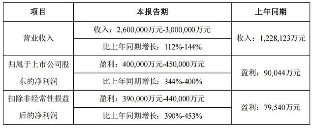 此外,最受關(guān)注的是其凈利潤的數(shù)據(jù),預(yù)計實(shí)現(xiàn)40-45億,同比增長344%-400%,而扣非凈利增幅更甚,同增更是高達(dá)390%-453%。