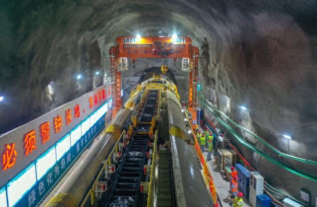“天岳號”總長87米、總重約900噸。施工作業(yè)時,“天岳號”沿50度大傾角由下斜井往上爬行掘進(jìn),在中平洞實現(xiàn)6.53米和8米變徑,最終從上斜井駛出,可實現(xiàn)兩級引水斜井全斷面連續(xù)開挖、初支一次成型。此次“天岳號”成功應(yīng)用,有助于我國抽水蓄能電站綠色智能建造。