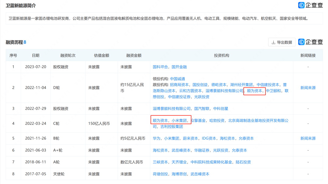 2022年3月,順為資本和小米集團(tuán)將共同投資衛(wèi)藍(lán)新能源,后者為蔚來半固態(tài)電池供應(yīng)商,專注于混合固液電解質(zhì)鋰離子電池和全固態(tài)鋰電池的研發(fā)、生產(chǎn),是中科院物理研究所清潔能源實(shí)驗(yàn)室固態(tài)電池技術(shù)的唯一產(chǎn)業(yè)化平臺。