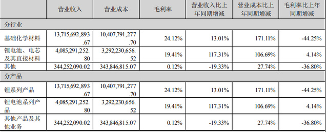今年上半年,贛鋒鋰業(yè)的鋰電池系列產(chǎn)品營業(yè)收入達到40.85億元,同比增長117.31%,占比首度突破20%達到22.5%,毛利率更是增長了4.14個百分點到19.41%,成為贛鋒鋰業(yè)唯一實現(xiàn)毛利率正增長的業(yè)務。