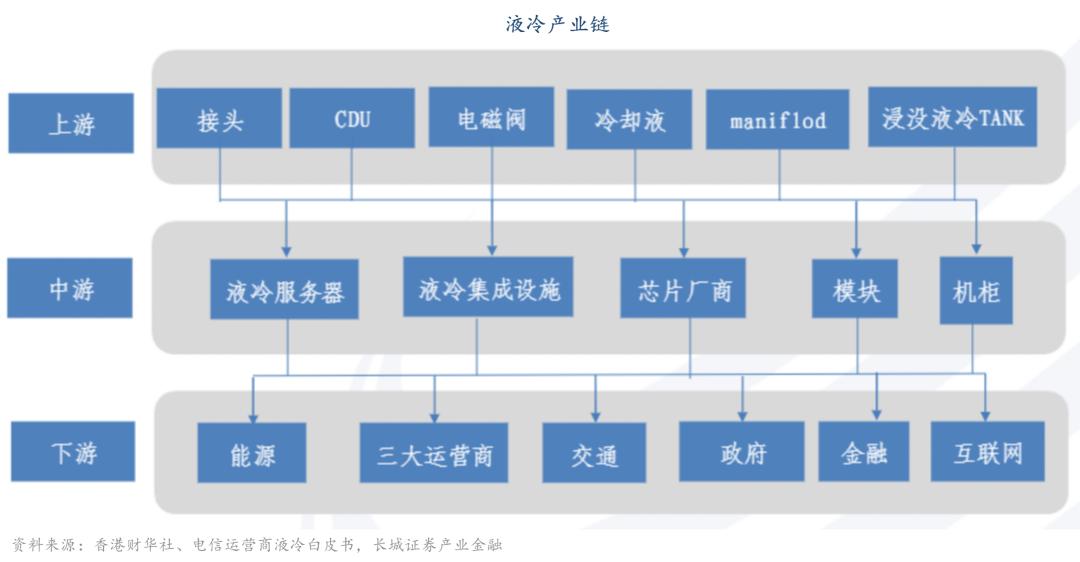 相比于風(fēng)冷技術(shù),液冷具有更高的冷卻效率和成長(zhǎng)性。根據(jù)中國(guó)證券報(bào)研究,產(chǎn)品零部件提供商、液冷服務(wù)器提供商及算力使用者貫穿整個(gè)液冷產(chǎn)業(yè)生態(tài)的上、中、下游。我國(guó)液冷技術(shù)起步稍晚于國(guó)外,但起步后發(fā)展迅速,后期與國(guó)外發(fā)展進(jìn)程基本同步,并且在液冷規(guī)模試點(diǎn)應(yīng)用方面積累了豐富經(jīng)驗(yàn)。