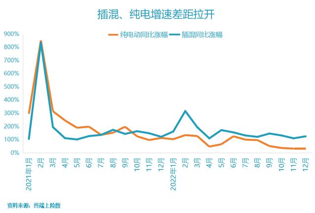 2022年開始,盡管新能源汽車增速仍然很快,但是純電和插混兩種車型增長形勢大不相同了。