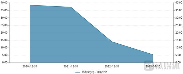 而細(xì)看公司儲能業(yè)務(wù)的毛利率,可以得知自2020年開始,該業(yè)務(wù)毛利率逐年下滑,其中2022年的下降幅度最為明顯。相關(guān)數(shù)據(jù)顯示,2020年—2022年及2023年上半年,儲能業(yè)務(wù)的毛利率分別為38.53%、37.17%、14.05%及5.41%。