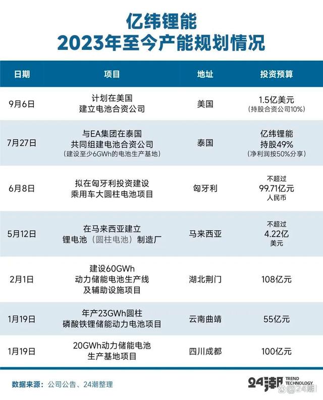 另據(jù)24潮團隊統(tǒng)計,在5月、6月和7月億緯鋰能三次發(fā)布擴張公告,其計劃投入上百億資金在馬來西亞、匈牙利和泰國獨資或合資建設(shè)電池基地項目,詳見下表