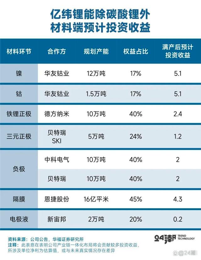 據(jù)華福證券預(yù)測,2022年億緯鋰能碳酸鋰可自供量約為2779噸,自供比列約為14%,未來還將逐年快速提升,至2024年其碳酸鋰自供比例將升至33%,根據(jù)其長遠產(chǎn)能規(guī)劃,未來很可能達到49%;而億緯鋰能在上游鈷鎳、正負極材料、隔膜以及電解液等材料領(lǐng)域的產(chǎn)業(yè)布局一旦滿產(chǎn)后,預(yù)計合計將實現(xiàn)22.3億元的投資收益。