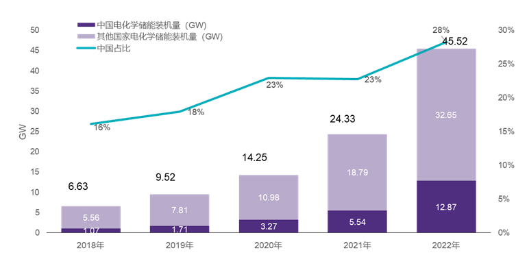 電化學(xué)儲能市場近年來裝機(jī)規(guī)模顯著提高。從全球范圍來看,2018年的裝機(jī)量是6.63GW,而到了2022年,這個數(shù)字已經(jīng)大幅增長到45.52GW。其中,中國市場的占比也有顯著提升,從2018年的16%增長到2022年的28%。