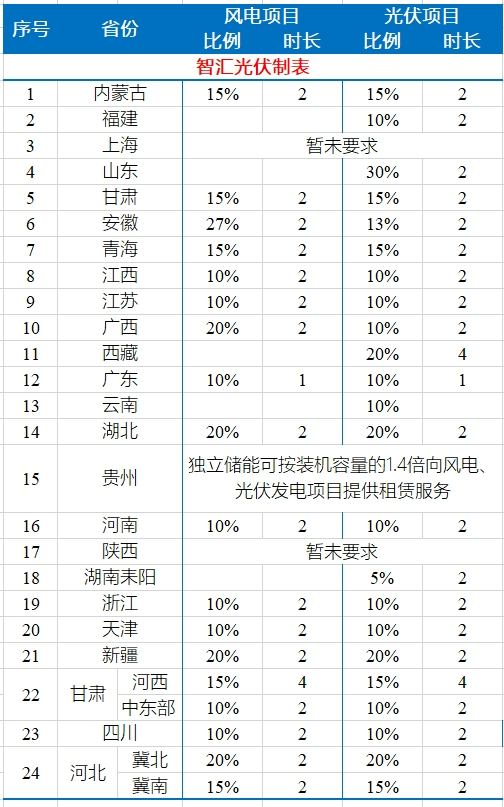 今年以來,全國各省陸續(xù)要求集中式新能源項目配儲。本文統(tǒng)計了24省/地區(qū)的配儲最低比例,如下表所示。