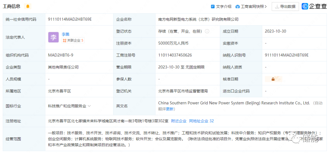 10月30日,南方電網(wǎng)新型電力系統(tǒng)(北京)研究院有限公司注冊(cè)成立,法定代表人為李鵬,注冊(cè)資本5億元人民幣,該公司由中國(guó)南方電網(wǎng)有限責(zé)任公司及旗下南方電網(wǎng)數(shù)字電網(wǎng)集團(tuán)有限公司、南方電網(wǎng)科學(xué)研究院有限責(zé)任公司共同持股。