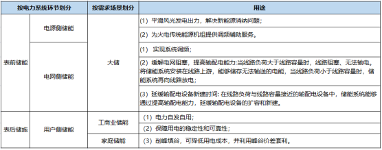 目前,儲(chǔ)能技術(shù)主要應(yīng)用于電力系統(tǒng)。具體而言,可以將儲(chǔ)能技術(shù)在電力系統(tǒng)中的典型應(yīng)用場景劃分為電源側(cè)、電網(wǎng)側(cè)和用戶側(cè)三個(gè)方面。其中電源側(cè)、電網(wǎng)側(cè)儲(chǔ)能又稱為表前儲(chǔ)能或大儲(chǔ),用戶側(cè)儲(chǔ)能又稱為表后儲(chǔ)能。用戶側(cè)儲(chǔ)能分為工商業(yè)儲(chǔ)能與戶儲(chǔ),兩者區(qū)別在于客戶群體。