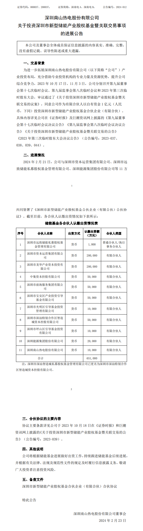 近日,深圳南山熱電股份有限公司發(fā)布《關(guān)于投資深圳市新型儲(chǔ)能產(chǎn)業(yè)股權(quán)基金暨關(guān)聯(lián)交易事項(xiàng)的進(jìn)展公告》。