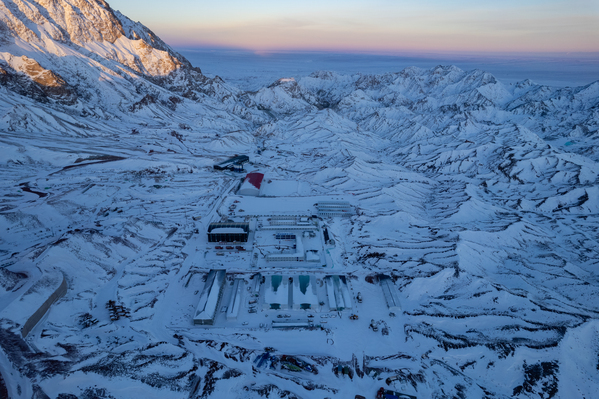 夕陽緩緩西沉,余暉灑在照壁山上,玉門項目建設現(xiàn)場在橙黃的光影中與雪山、戈壁相融。寒風吹拂著項目建設者通紅的臉頰,但他們依舊忙碌不停。他們用拼搏在這片土地上書寫壯麗篇章,奏響奉獻贊歌。(張擎宇)