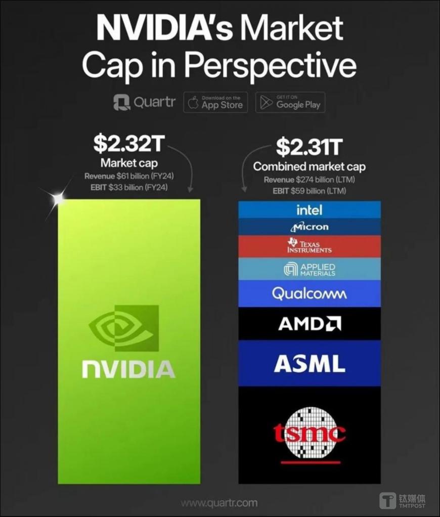 鈦媒體App 5月24日消息,截至今早美股收盤,“AI之王”英偉達(NASDAQ:NVDA)市值一天內(nèi)暴漲2180億美元(約合人民幣1.56萬億元),達到2.56萬億美元市值——超過臺積電、阿斯麥、AMD、高通、應用材料、德州儀器、美光科技、英特爾等半導體巨頭的市值總和。同時,股價也首次沖破1000美元/股,創(chuàng)下歷史新高。