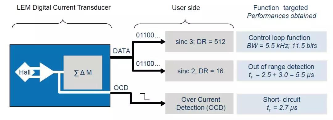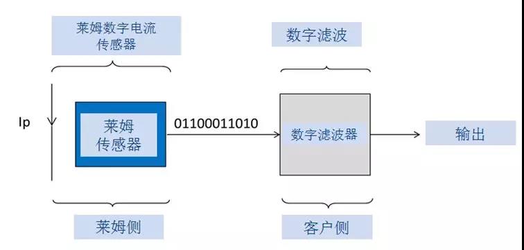 LEM公司針對(duì)數(shù)字化的市場(chǎng)需求,在經(jīng)典開(kāi)環(huán)傳感器的基礎(chǔ)上基于∑-△ ADC的技術(shù),開(kāi)發(fā)出了一系列的先進(jìn)數(shù)字輸出傳感器。其基本原理如圖1所示。