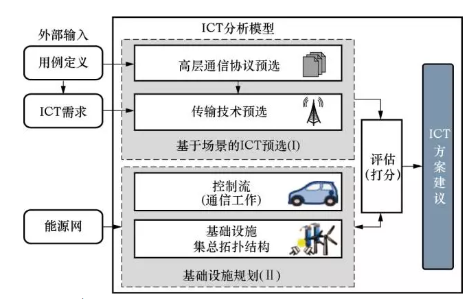 對(duì)ICT的研究是個(gè)較為前沿的課題。文獻(xiàn)[10]提出了一種應(yīng)用于智能配電網(wǎng)規(guī)劃的ICT模型,如圖3所示。此模型主要分為兩部分:基于場(chǎng)景的預(yù)選和基礎(chǔ)設(shè)施規(guī)劃。首先,不考慮網(wǎng)絡(luò)和基礎(chǔ)設(shè)施的具體情況進(jìn)行預(yù)選,生成ICT技術(shù)方案通用集合和高層協(xié)議;其次,針對(duì)具體的能源網(wǎng)進(jìn)行基礎(chǔ)設(shè)施規(guī)劃,確定若干ICT技術(shù)方案;這兩部分均依賴于由規(guī)劃人員提供的外部數(shù)據(jù),例如所定義的用例和對(duì)ICT的各種需求。最后,對(duì)兩部分的輸出進(jìn)行成本效益分析,針對(duì)給定的外部數(shù)據(jù)確定合適的ICT技術(shù)方案。正如文獻(xiàn)[10]所指出的,對(duì)ICT進(jìn)行合理規(guī)劃可以避免使用擴(kuò)建電網(wǎng)的傳統(tǒng)手段,延緩電網(wǎng)的一次投資。