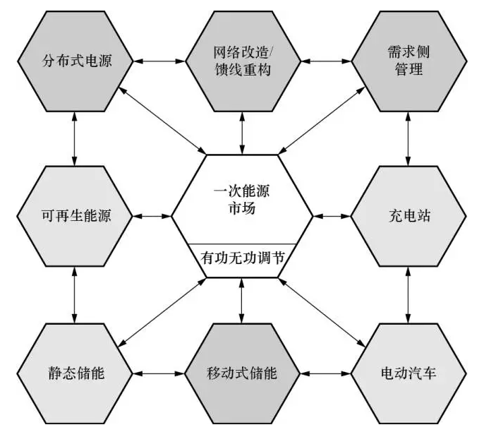 為了輔助智能電網(wǎng)規(guī)劃人員確保系統(tǒng)運(yùn)行的安全性,可靠性以及供電質(zhì)量,需要開發(fā)綜合全面的新工具。文獻(xiàn)[16]通過對(duì)智能技術(shù)及其交互方式進(jìn)行分類,設(shè)計(jì)了一個(gè)專為智能電網(wǎng)規(guī)劃人員量身定做的工具箱架構(gòu)(如圖5所示)。規(guī)劃人員在確定電網(wǎng)建設(shè)和饋線重構(gòu)方案時(shí),并非像傳統(tǒng)做法那樣只考慮峰荷,而是同時(shí)考慮分布式電源(DG)、移動(dòng)式存儲(chǔ)和需求側(cè)管理(DSM),這樣得到的方案更具成本效益。通過可再生能源和靜態(tài)儲(chǔ)能相互配合可以削峰填谷,增加網(wǎng)絡(luò)容量;充電站的電動(dòng)汽車耗電量受實(shí)時(shí)電價(jià)變化的影響,因此可作為DSM的一部分;各類儲(chǔ)能設(shè)備可被用來提升電能質(zhì)量,因此可被視為有功/無功功率源;一次能源市場(chǎng)運(yùn)行人員在擁有發(fā)電和儲(chǔ)能資源的輸配電運(yùn)行人員之間進(jìn)行協(xié)調(diào)優(yōu)化,得到實(shí)時(shí)電價(jià),通過AMI提供給用戶。此工具箱的理念和結(jié)構(gòu)尚未成熟,還需在未來的研究工作中進(jìn)一步完善。