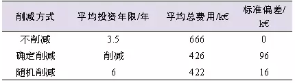 由于規(guī)劃周期較長(zhǎng),考慮了未來峰荷發(fā)展和DG接入容量的變電站規(guī)劃面臨很大的不確定性和投資風(fēng)險(xiǎn),所以必須進(jìn)行風(fēng)險(xiǎn)評(píng)估。文獻(xiàn)[7]在相同功率約束條件下,對(duì)投資變電站和削減配電側(cè)DG發(fā)電出力兩種技術(shù)方案進(jìn)行了比較,給出了優(yōu)化的折中方法。該文獻(xiàn)以30MW變電站接入不同光伏容量(0、1、9.5MW)的情形為例,對(duì)各種削減模式下延緩?fù)顿Y的效果進(jìn)行了比較,結(jié)果如表2所示,與不削減DG容量相比,采用確定(定時(shí))削減方式,投資年限可延緩3.4年,投資費(fèi)用可減少9.6萬歐元;采用隨機(jī)削減方式,投資年限則可延緩2.5年、投資費(fèi)用可減少1.6萬歐元。因?yàn)閷?shí)際參數(shù)的隨機(jī)特性會(huì)影響計(jì)算結(jié)果,所以真正的延緩?fù)顿Y效果主要取決于預(yù)測(cè)模型的精度。