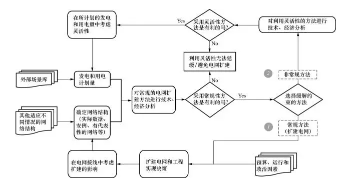目前,法國(guó)配電公司(ERDF)正在研究如何利用發(fā)電側(cè)和需求側(cè)的靈活性來緩解電壓、線路傳輸容量的限制,從而避免/延緩電網(wǎng)擴(kuò)建的問題,文獻(xiàn)[13]就此給出了一個(gè)通用框架(如圖4所示),對(duì)常規(guī)的電網(wǎng)擴(kuò)建方法和利用電網(wǎng)靈活性的方法進(jìn)行技術(shù)、經(jīng)濟(jì)比較,選擇成本效益最高的作為最終方案。發(fā)電、用電資源的靈活性是從容量、持續(xù)時(shí)間和頻率等幾方面來定義的,而這不僅需要負(fù)荷持續(xù)時(shí)間曲線,還需要隨機(jī)時(shí)序負(fù)荷曲線,其預(yù)測(cè)方法也是ERDF目前正致力于研究的一個(gè)領(lǐng)域。在進(jìn)行技術(shù)、經(jīng)濟(jì)比較時(shí),主要是比較采用某方案所需要的成本和該方案能夠減少電量不足期望值(ExpectedEnergyNotSupplied,EENS)所帶來的收益,如果前者小于后者,則該方案是具有成本效益的。另外,文獻(xiàn)[13]認(rèn)為,雖然在有些情況下利用電網(wǎng)靈活性可能很難達(dá)到電網(wǎng)擴(kuò)建后高可靠、高質(zhì)量的供電,但是如果能夠獲得較好的成本效益,利用電網(wǎng)靈活性來推遲電網(wǎng)擴(kuò)建也是合理的。