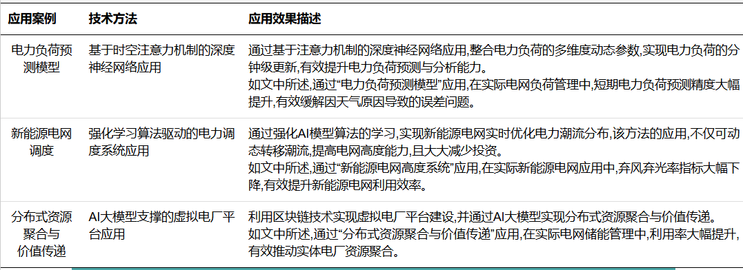 傳統(tǒng)的電力系統(tǒng)供需匹配存在發(fā)電慣性大、儲能能力不足、調峰能力有限、跨區(qū)域調配壁壘等問題,在大模型技術支撐下電力系統(tǒng)供需匹配的復雜性得到系統(tǒng)性突破?;跁r空注意力機制(指在時間和空間維度上對輸入數(shù)據(jù)進行自適應處理的方法)的深度神經網絡,整合用戶側用電數(shù)據(jù)、分布式能源+儲能、電力市場交易信息等多維度動態(tài)參數(shù),構建起分鐘級更新的負荷預測模型。筆者根據(jù)《國家電網報》的數(shù)據(jù)統(tǒng)計得出:2024年,在華東某省級電網的實測中,基于智能電網的AI大模型預測電網負荷,全網平均負荷預測準確率達98.49%,日最高負荷預測準確率達99.08%,數(shù)據(jù)收集工作時長從30 min縮短至2 min,有效緩解傳統(tǒng)預測方法因天氣突變導致的誤差放大問題;針對高比例新能源接入的電網,強化學習算法驅動的調度系統(tǒng)實時優(yōu)化電力潮流分布,在西北某新能源基地的應用案例中,棄風棄光率(指在一定時間內,因各種原因導致的風電和光伏發(fā)電未能被充分利用的比例)從12.6%降至3.8%,分布式潮流控制裝置總容量為5.8萬kVA,可動態(tài)轉移潮流10萬kW;大模型支撐的虛擬電廠平臺聚合海量分布式資源,通過區(qū)塊鏈技術實現(xiàn)價值傳遞,在國家電網廣東省試點項目中,用戶側儲能系統(tǒng)的利用率提升60%,需求響應參與度達到83%,通過智能化的供需協(xié)同機制與AI大模型的深度應用(如表2所示),推動電力系統(tǒng)向“源網荷儲”深度互動的新型模式演進[3]。同時,為避免單一數(shù)據(jù)源出現(xiàn)信息失真,國家電網通過AI大模型對溫度、濕度、風速等主要參數(shù)進行三重校驗與交叉驗證,有效避免數(shù)據(jù)誤差造成預測失真的問題。
