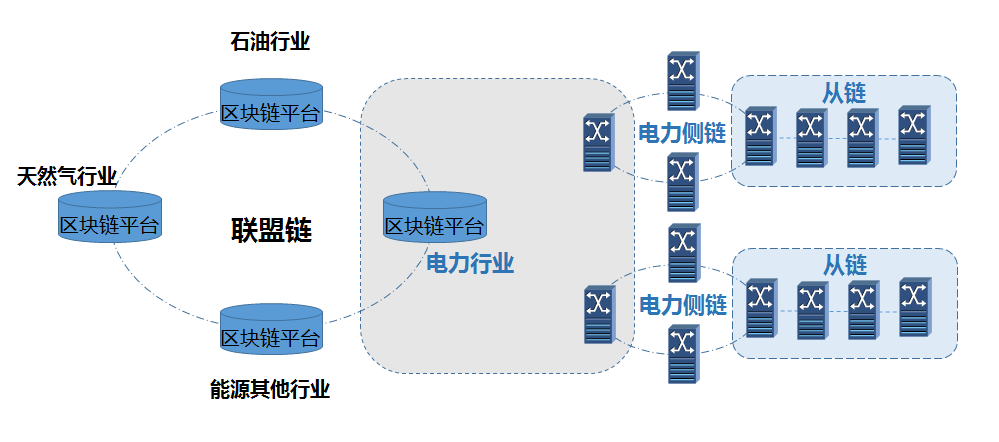 能源區(qū)塊鏈平臺以聯(lián)盟鏈架構(gòu)為基礎(chǔ),采用“主、側(cè)、從”多鏈混合模式(見圖1),構(gòu)建覆蓋電力、石油、天然氣等各類能源業(yè)務(wù)應(yīng)用的區(qū)塊鏈公共服務(wù)平臺,為能源行業(yè)跨地域、跨企業(yè)的多方協(xié)同與信任傳導提供支撐。