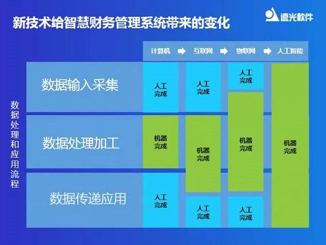 新技術(shù)會令智慧財務(wù)管理系統(tǒng)帶來哪些變化?陳婷表示改變主要體現(xiàn)在三個階段,即數(shù)據(jù)的輸入采集階段、數(shù)據(jù)的處理加工階段和數(shù)據(jù)的傳遞應(yīng)用階段。