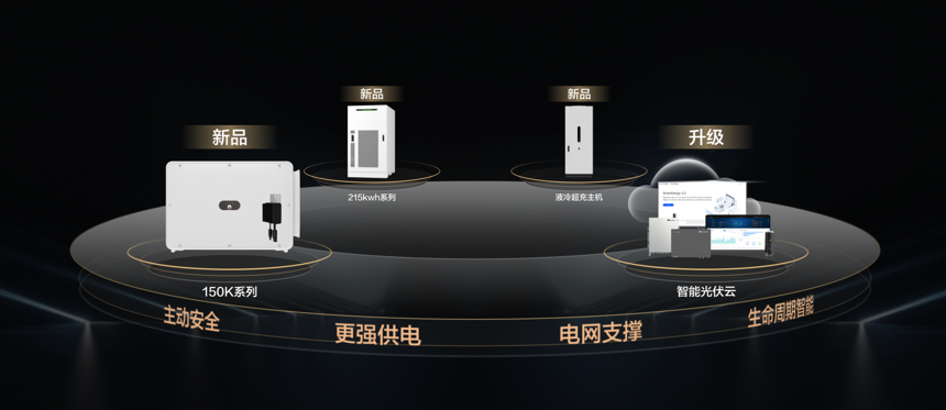 此次重點推出了150K更大功率工商業(yè)逆變器、行業(yè)首款風(fēng)液智冷工商業(yè)儲能、360kW/480kW液冷超充主機(jī)、全新升級的智能光伏云等。