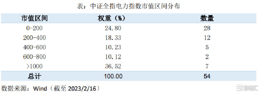 從市值分布來看,中證全指電力指數呈現較為明顯的中小盤特征,其中市值規(guī)模在400億之下的成份股權重合計占比為43%,數量達到40只。