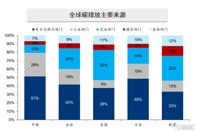 另外,分部門而言,電力和熱力部門碳排放的比例要遠高于工業(yè)、交運、建筑及其他部門;同時,中國要遠高于全球其他國家和地區(qū),甚至比歐美等發(fā)達國家還要高。