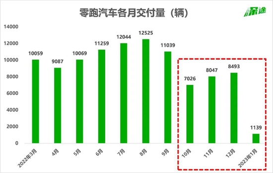 比較讓人意外的是零跑。1月只交付了1139輛,而去年12月是8493輛,環(huán)比下跌幅度達到87%。零跑現(xiàn)在是明顯的后勁不足,去年有連續(xù)5個月交付過萬,從10月開始掉到七八千的水平。1月的成績用“撲街”來形容再合適不過了。