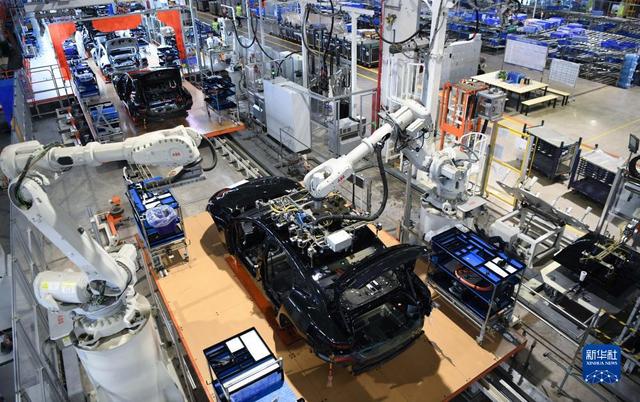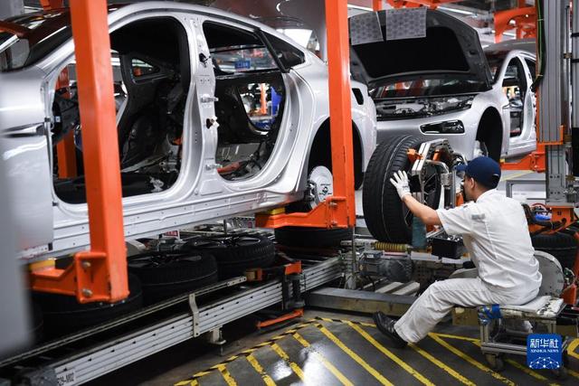 10月9日,工作人員在廣東肇慶小鵬汽車智能網(wǎng)聯(lián)科技產(chǎn)業(yè)園內(nèi)的總裝生產(chǎn)線上工作。