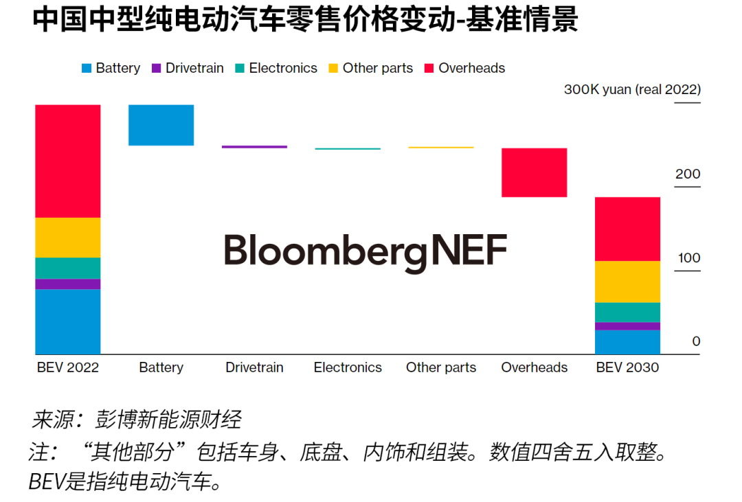 降低成本對(duì)新能源車企至關(guān)重要,因?yàn)榇蠖鄶?shù)車企尚未從新能源汽車的銷售中獲利。彭博新能源財(cái)經(jīng)估計(jì),從2022年到2030年底,電池價(jià)格下跌以及轉(zhuǎn)用專用平臺(tái)可能會(huì)使中國(guó)純電動(dòng)汽車價(jià)格下降40%。結(jié)合其他零部件和系統(tǒng)的改進(jìn),這可能會(huì)推動(dòng)純電動(dòng)汽車在2027年至2029年間實(shí)現(xiàn)燃油車平價(jià)。更廉價(jià)的電池、平臺(tái)協(xié)同效應(yīng)和產(chǎn)業(yè)價(jià)值鏈整合也是大眾汽車和比亞迪等公司成本降低路線圖的核心。