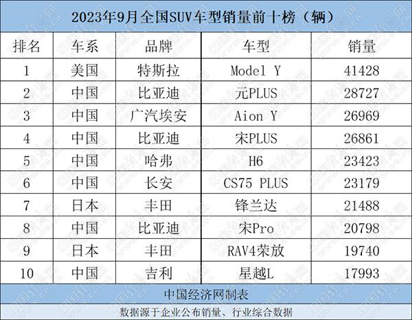 聚焦具體車型表現(xiàn),特斯拉Model Y共售出41428輛,強(qiáng)勢(shì)收獲月度五連冠。比亞迪(002594)元PLUS、宋PLUS、宋Pro銷量齊齊突破2萬(wàn)輛,三款車型合計(jì)銷量達(dá)76386輛,占前十SUV總銷量的30.48%,更顯整體實(shí)力。