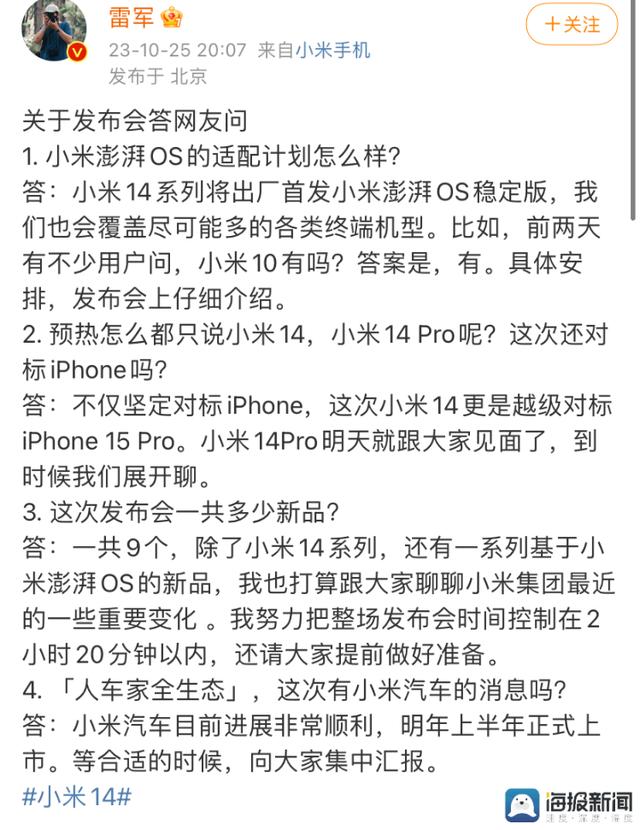 10月25日,小米董事長雷軍在社交平臺上回復(fù)網(wǎng)友問題時稱:“小米汽車目前進(jìn)展非常順利,明年上半年正式上市。等合適的時候,向大家集中匯報。”