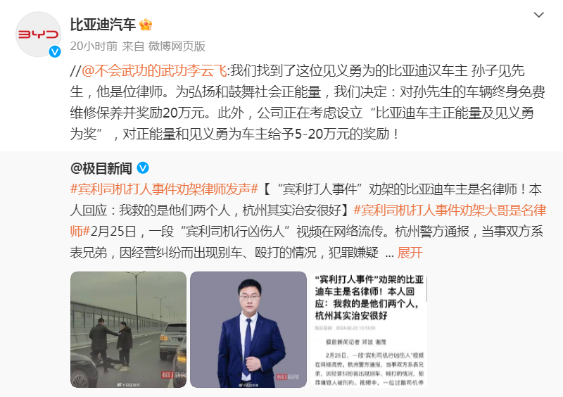 比亞迪對(duì)勸架車(chē)主獎(jiǎng)勵(lì)20萬(wàn)元