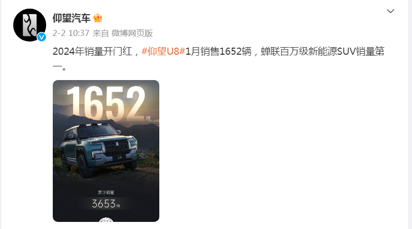 2023年9月,仰望汽車(chē)旗下首款產(chǎn)品仰望U8豪華版上市,上市價(jià)格為109.8萬(wàn)元。數(shù)據(jù)顯示,仰望U8在2024年1月銷(xiāo)售1652輛,上市交付兩月余已累計(jì)3653輛。