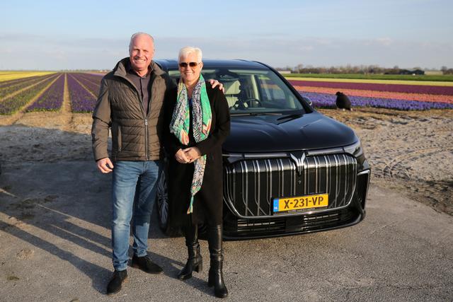 3月25日,荷蘭消費者埃里克·贊德貝亨和他的妻子埃倫在嵐圖汽車前合影。新華社記者趙丁喆攝