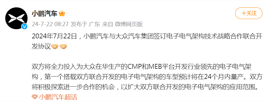 根據(jù)小鵬汽車公告,在上述合作中,小鵬汽車與大眾汽車集團在廣州和合肥建立了聯(lián)合開發(fā)項目組。