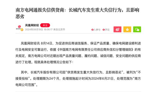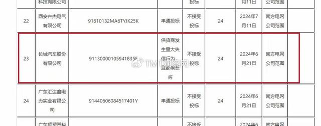 其中,長城汽車股份有限公司因“供貨商發(fā)生重大失信行為,且影響惡劣”,被列為“不接受投標(biāo)”。處理期限為24個(gè)月,處理措施起計(jì)時(shí)間為2024年6月21日,處理范圍為“南方電網(wǎng)公司范圍”。