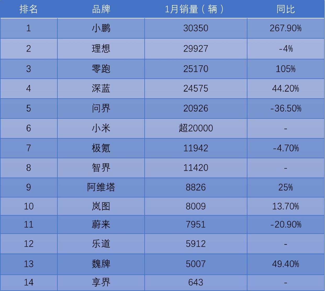 但仍有企業(yè)實現(xiàn)銷量“開門紅”,其中小鵬汽車、奇瑞汽車(新能源)、零跑汽車1月銷量增長率均突破100%。小鵬汽車更是以268%的增長率,時隔30個月后再次登頂新造車企業(yè)銷量排行榜。同時,小米汽車以月銷超2萬輛首次超越了蔚來。