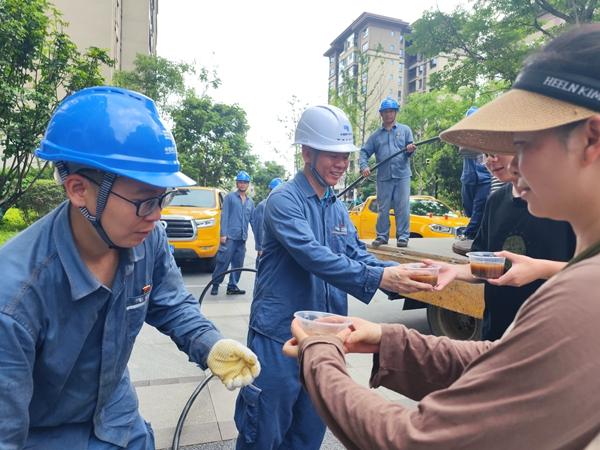 6月22日,桂林市萬達翰林府小區(qū)群眾為正在開展搶修復電的南方電網(wǎng)廣西欽州靈山供電局黨員突擊隊員們送上綠豆湯。陳心誠攝