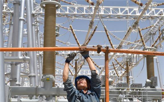 5月27日,工作人員在位于寧夏吳忠市同心縣的妙嶺750千伏變電站施工現(xiàn)場施工。