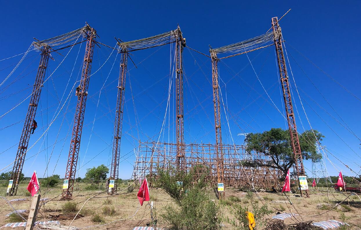 在跨越點(diǎn)位置,兩條單回路走向與桑錫鐵路的交叉角度分別為62°、63°,交叉角度大,施工相對困難。項(xiàng)目部根據(jù)現(xiàn)場實(shí)地勘察,并結(jié)合以往跨越鐵路施工經(jīng)驗(yàn),采用了“在桑錫鐵路網(wǎng)圍欄兩側(cè)搭設(shè)獨(dú)立抱桿跨越架,在跨越架之間用絕緣桿封網(wǎng)”的方式進(jìn)行跨越施工。為保障跨越施工順利完成,送變電公司配備精兵強(qiáng)將,項(xiàng)目部提早完成跨越手續(xù)辦理。班組負(fù)責(zé)人、防護(hù)員、安全員、技術(shù)員、駐站聯(lián)絡(luò)員等全程到崗到位。經(jīng)過13天精心準(zhǔn)備,牽張場地布置、跨越架和防護(hù)架搭設(shè)、各種工器具和導(dǎo)地線及光纜進(jìn)場等各項(xiàng)準(zhǔn)備工作全部就緒。