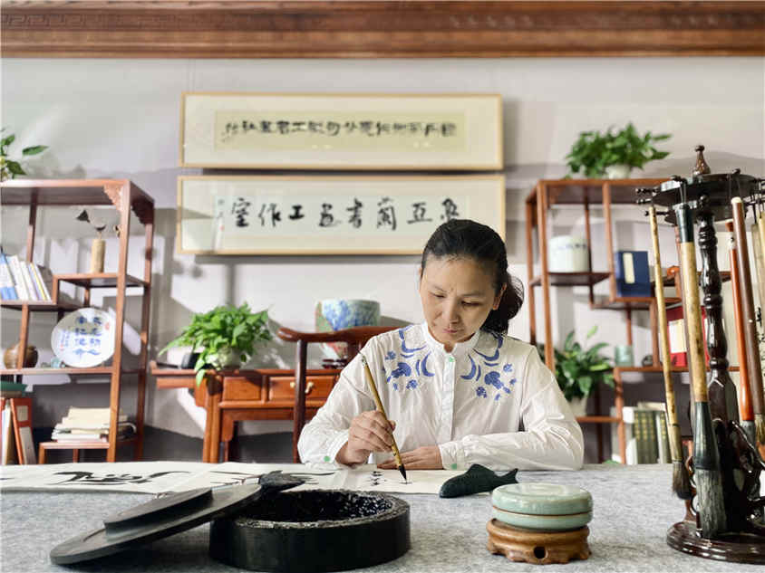 走進魯亞蘭書畫工作室,午后陽光斜照,滿室墨香氤氳。墻上懸掛的一幅隸書作品,筆力雄渾如鐵畫銀鉤,氣韻生動若行云流水,落款處“魯亞蘭”三字清雅蘊藉。這身非凡造詣,源于一方硯臺的啟蒙。