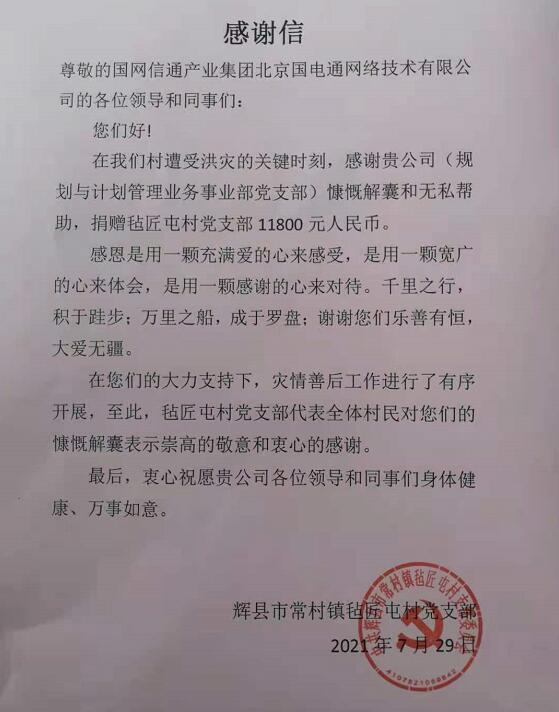 中國電力網訊 (通訊員 朱友宇) “在您們的大力支持下,災情善后工作進行了有序開展,至此,氈匠屯村黨支部代表全體村民對您們的慷慨解囊表示崇高的敬意和衷心的感謝”,輝縣市常村鎮(zhèn)氈匠屯村黨支部在感謝信中寫道。7月29日,國網信通產業(yè)集團國電通規(guī)劃與計劃管理業(yè)務事業(yè)部黨支部收到了一封特殊的感謝信,這封信不是來自用戶的,也不是來自上級單位的,它來自輝縣市常村鎮(zhèn)氈匠屯村黨支部。