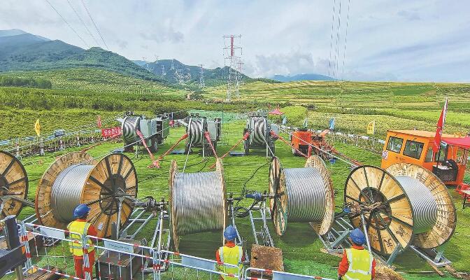 日月山—杜鵑雙回線(xiàn)路工程導(dǎo)線(xiàn)展放作業(yè)現(xiàn)場(chǎng)。鄒建華 攝